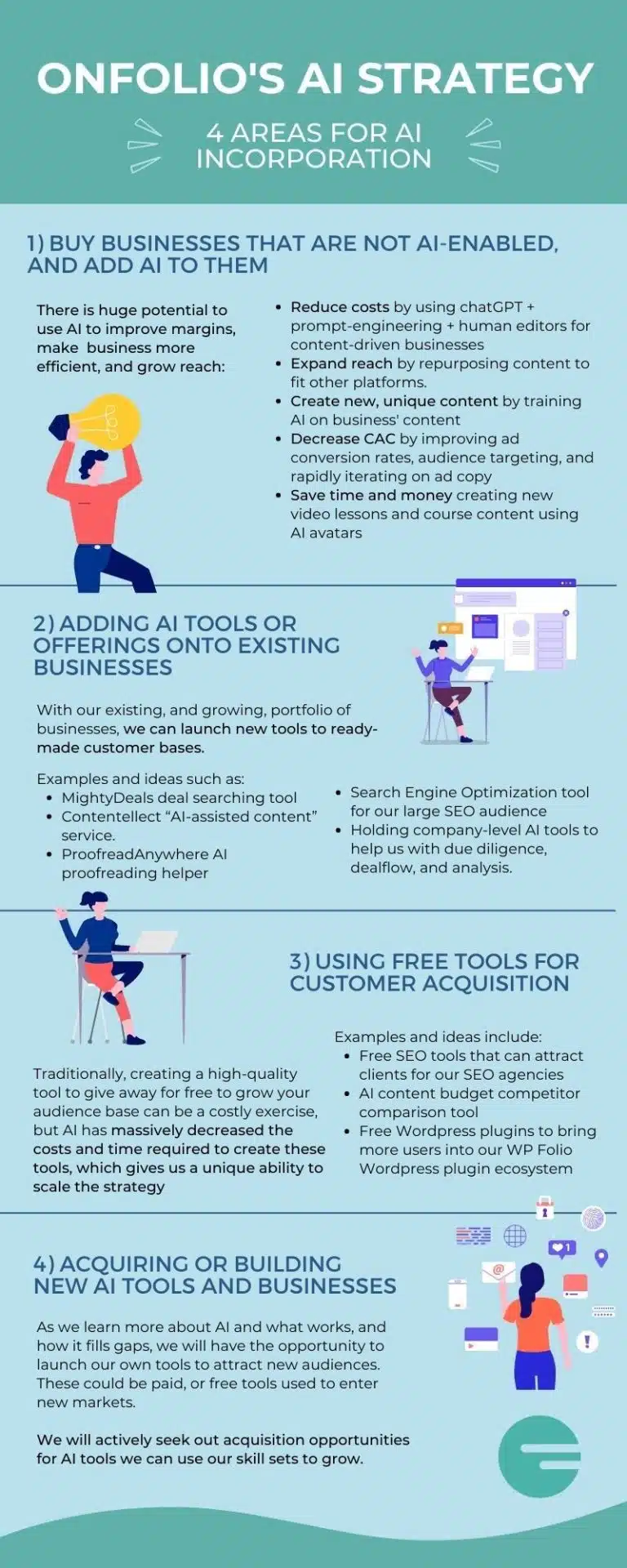这是一张关于Onfolio的AI战略的信息图,包括四个领域,即将AI添加至非AI企业、为现有企业添加AI工具或服务、使用免费工具获得客户和收购或建立新的AI工具和企业。该信息图提供了许多例子和想法,涉及内容包括降低成本、提高效率、增加收入、扩大覆盖范围等。