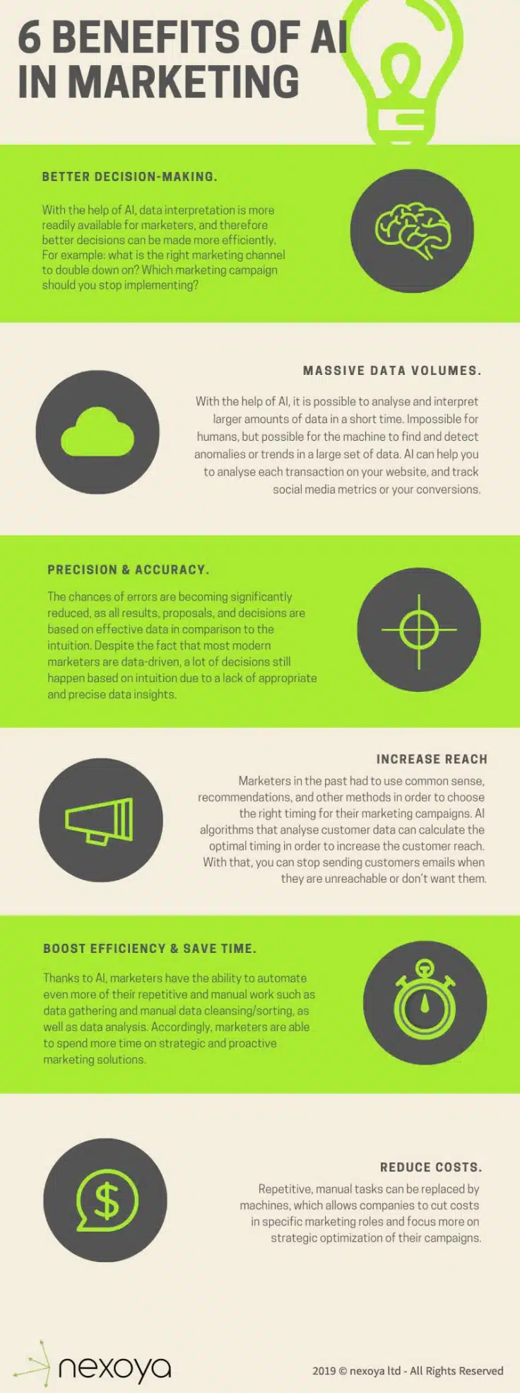 了解AI在营销中的6大优势:更好的决策、处理海量数据、精准度和准确性、增加覆盖面、提高效率节省时间以及降低成本。AI技术能帮助营销人员优化渠道选择、分析网站交易、跟踪社交媒体和转化率,最终实现更高效、更精准的营销策略。