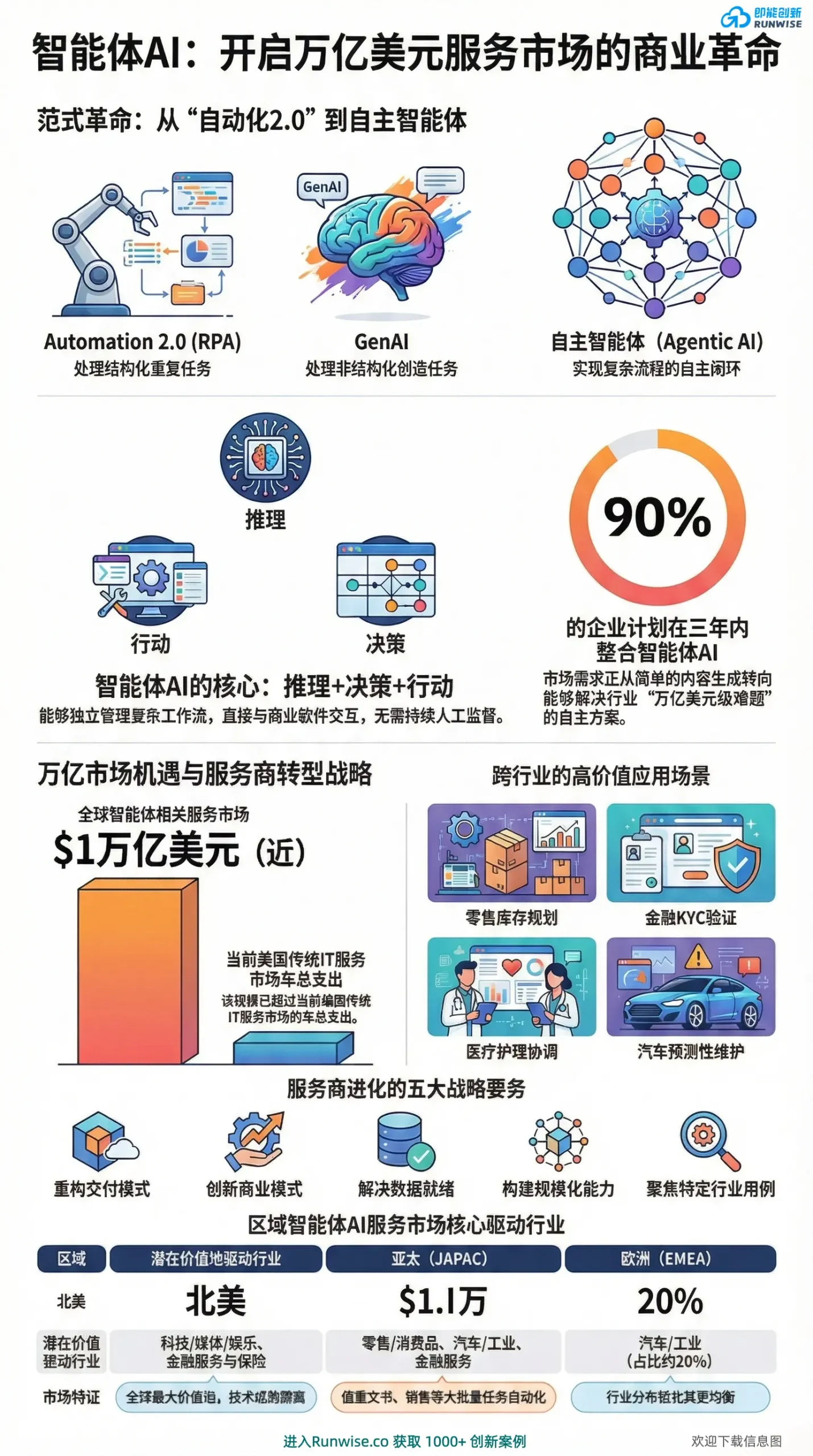 💡 深度图解: 如图所示,智能体 AI (Agentic AI) 绝非简单的技术迭代,而是一场价值万亿美元的商业革命。这张全景图清晰描绘了 AI 的进化路径:从处理结构化任务的“自动化 2.0 (RPA)”,到生成内容的 GenAI,最终进化为具备“推理+决策+行动”能力的自主智能体。图中不仅量化了全球服务市场的巨大机遇(超越美国传统 IT 服务总支出),还为服务商指明了从“重构交付模式”到“聚焦行业用例”的五大战略进化方向。这是 IT 服务商从技术实施者转型为业务转型伙伴的终极蓝图。
