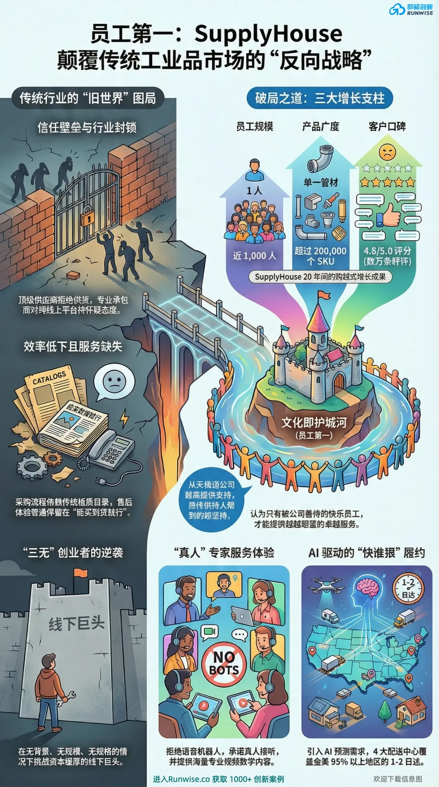 本报告旨在解码一个非凡的商业奇迹:SupplyHouse.com。在由行业巨头主导、关系驱动、效率低下的传统暖通空调(HVAC)与管道分销行业,SupplyHouse.com作为一家无行业背景、无技术壁垒的初创企业,成功实现了颠覆式增长。其核心并非依赖资本或技术优势,而是颠覆性地将 “员工第一” 的文化哲学作为企业核心战略,并由此衍生出三大支柱创新:1) 极致的“真人”客户服务体验;2) AI驱动的敏捷供应链网络;3) 专注服务专业人士的纯线上B2B商业模式。