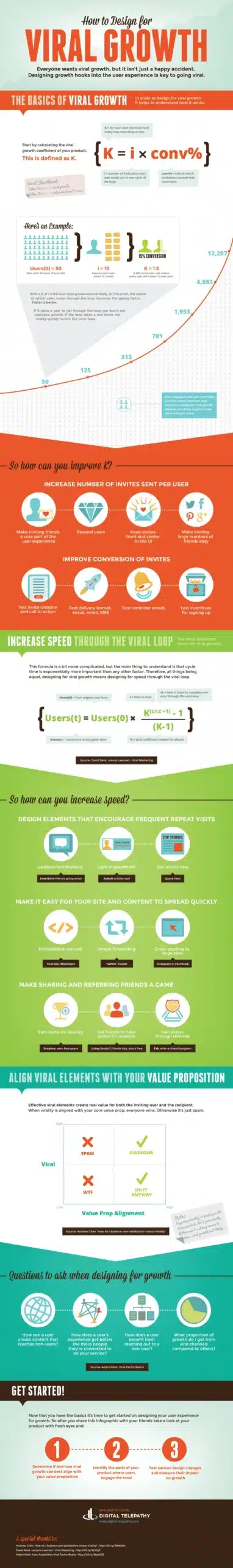 了解如何通过将增长钩子设计到用户体验中来实现病毒式增长。信息图详细解释了计算病毒增长系数K的方法,并提供了提高K的方法,包括增加每用户的邀请数量、提高邀请的转换率和加速病毒循环速度。