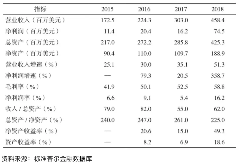 加拿大鹅(Canada Goose)公司成立于1957年,总部位于加拿大多伦多,是近5年成长最快的服饰品牌,主营羽绒服、保暖夹克、保暖背心、手套等保暖御寒服饰,工厂位于加拿大温尼伯(Winnipeg),员工总数1 716人,占全加拿大服饰用工数的6%。其近几年的主要财务指标如表所示。