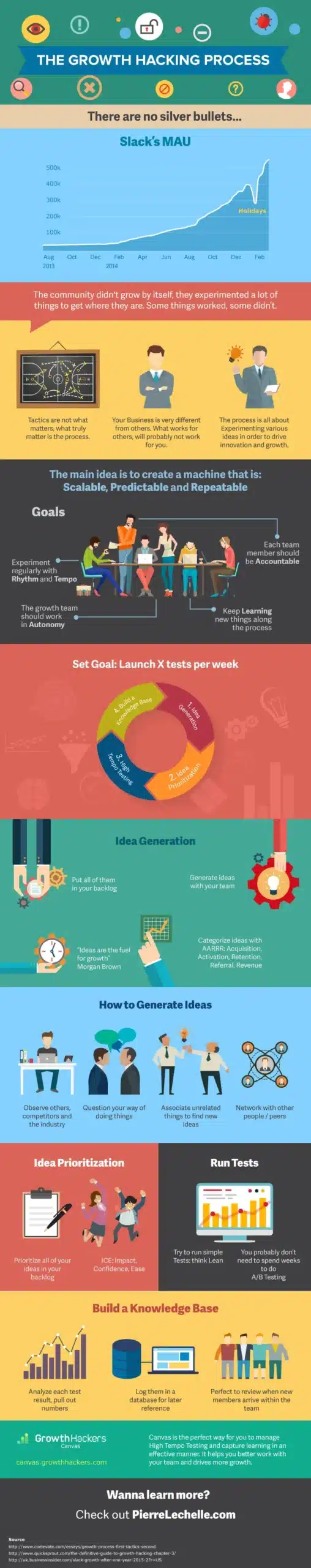 本信息图展示了增长黑客的过程,强调通过实验不同的想法来驱动创新和增长。包括生成创意、筛选创意、进行测试以及分析结果的步骤,最终建立一个可扩展、可预测和可重复的增长机器。