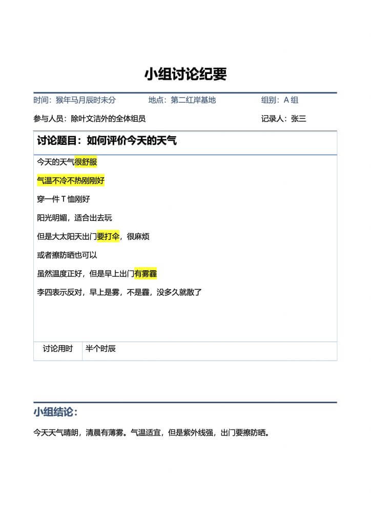 在这里,我们为大家准备了一个小组讨论纪要的模板,大家下载后可以模仿着填写,也可以依照自己喜欢的表达方式进行记录。