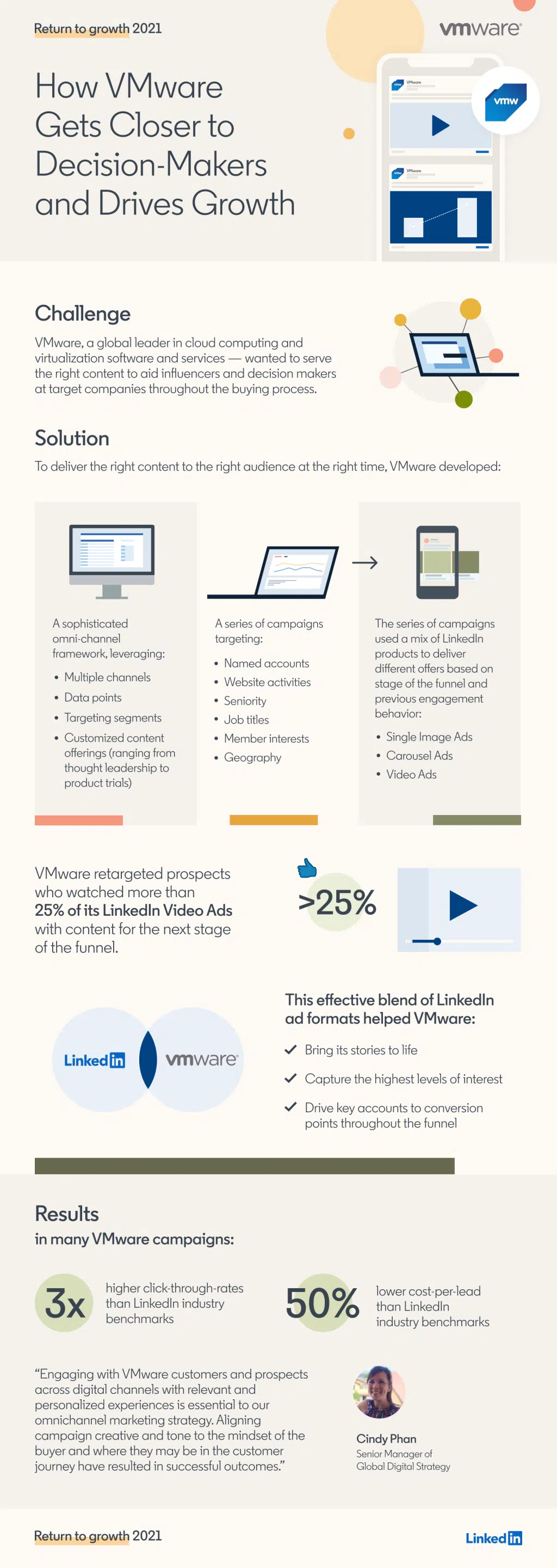 如何让VMware更接近决策者并推动增长挑战?通过使用LinkedIn框架和多渠道定位,VMware成功开发了一系列广告活动,提供定制化内容,帮助其展示故事、吸引关注、促进转化,并在许多活动中实现了高点击率和低成本。