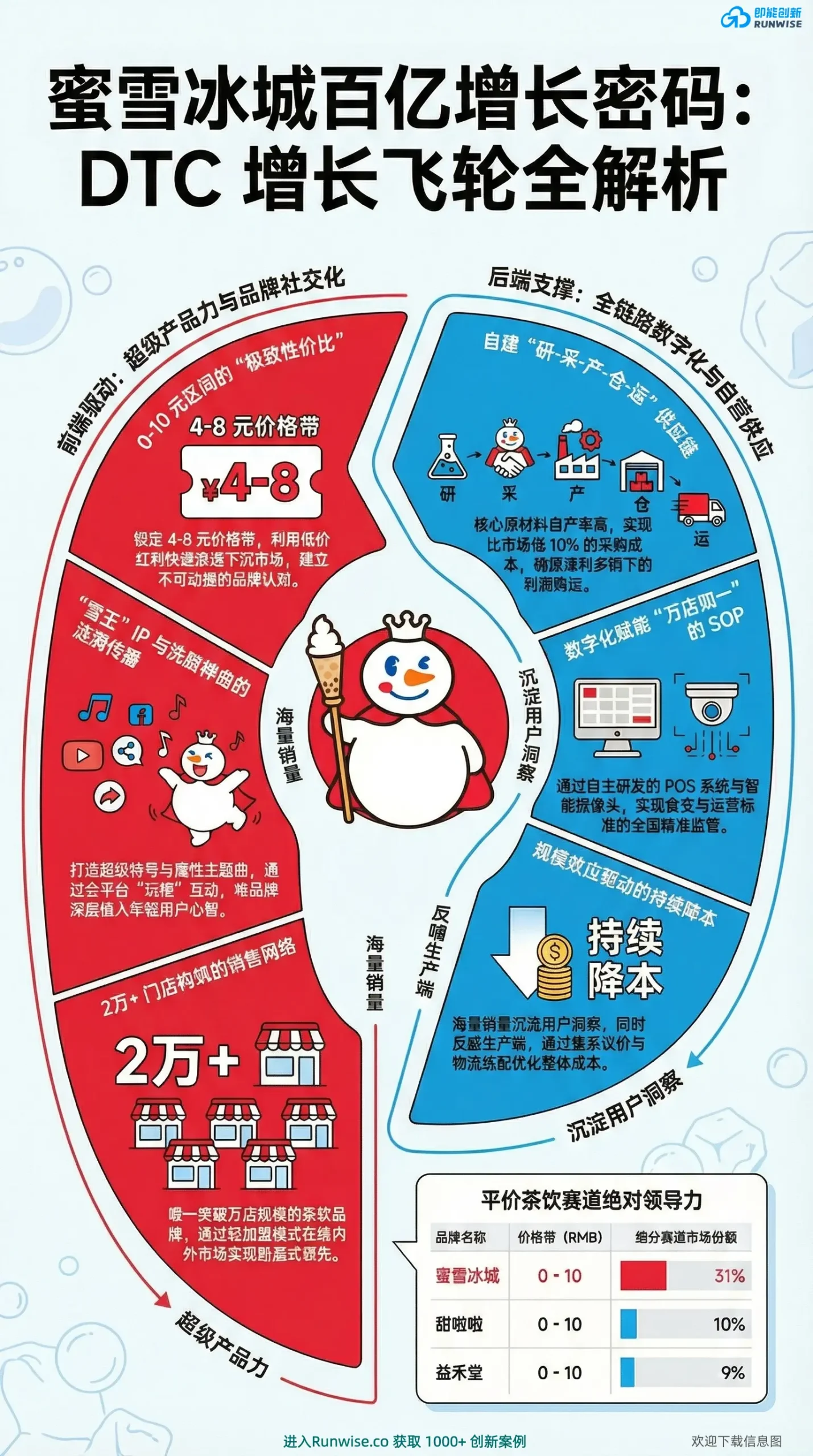 蜜雪冰城凭借极具杀伤力的定价策略和病毒式营销,在竞争白热化的茶饮市场完成了从下沉市场到全球扩张的华丽转身,稳居百亿营收俱乐部。面对连锁品牌扩张中常见的万店难如一和利润稀薄等增长瓶颈,蜜雪冰城究竟是如何构建起无法逾越的护城河?这张【DTC增长飞轮全景图】将带你洞察真相。