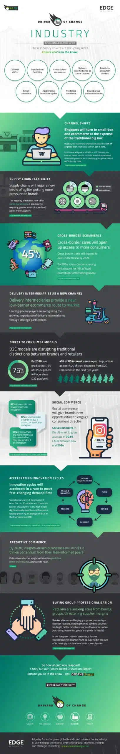 这个信息图展示了未来零售业的变革和创新趋势,包括渠道变化、供应链灵活性、跨境电商、送货中介和D2C模式等。了解这些趋势,让你保持信息更新。