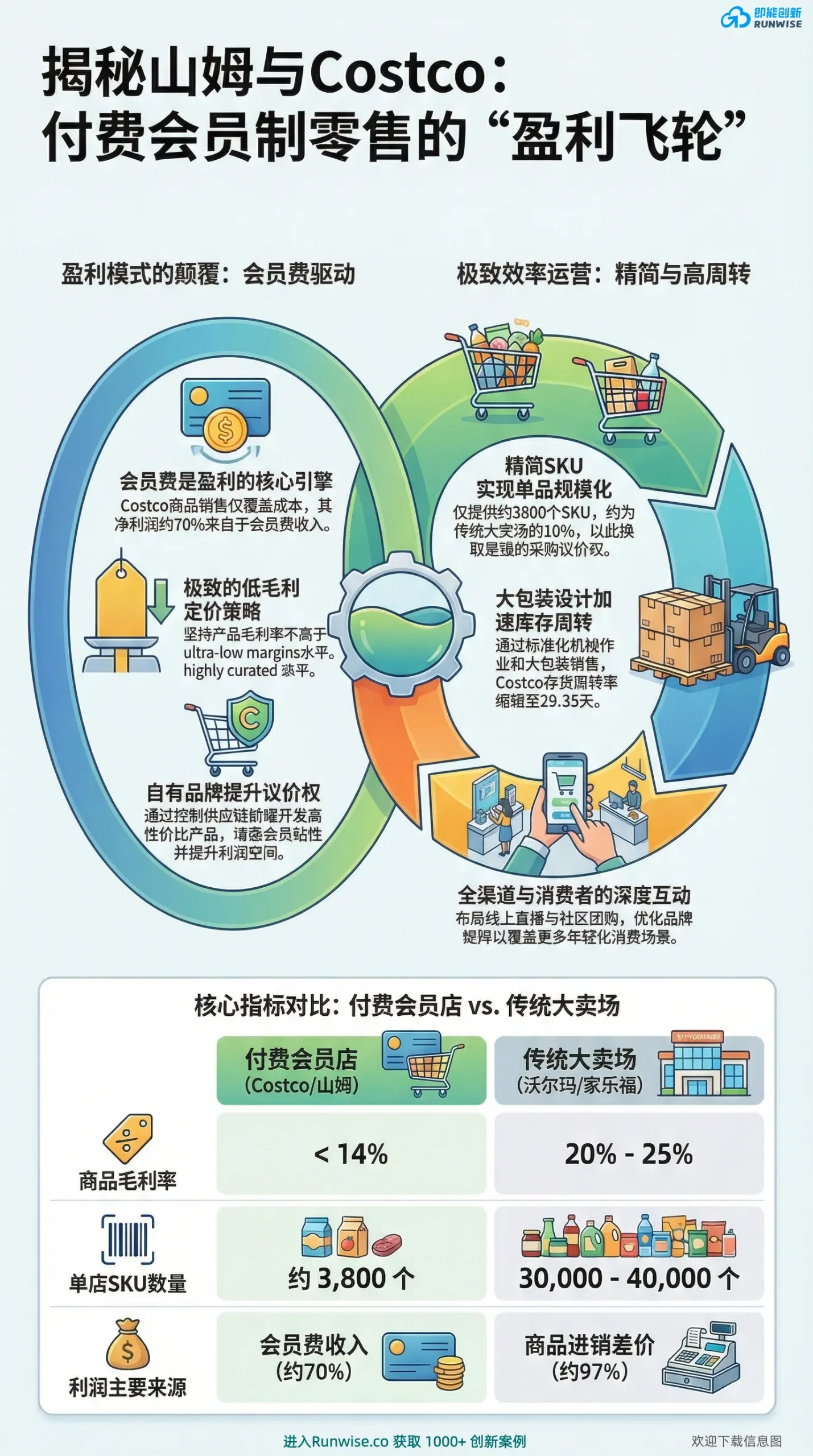 当传统大卖场正深陷闭店潮与流量焦虑时,山姆与Costco却凭借“先交钱再进店”的逆向逻辑,在全球范围内掀起了疯狂的会员购物浪潮。这并非简单的规模化,而是一场对零售底层利润结构的降维打击。为了拆解这套让数千万家庭产生极高粘性的增长系统,我们独家绘制了一张【山姆与Costco会员模式战略全景分析图】。它揭示了从SKU精选到供应链压榨背后的7大核心创新。那个让用户从“货比三家”转向“闭眼入”的关键开关在哪里?