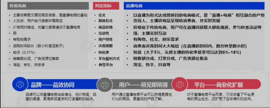 相对于传统电商,直播电商具备更加丰富、更立体的商品展现形式、更加即时的互动效果等多方优势,实现了由“人找货”到“货找人”的转变。