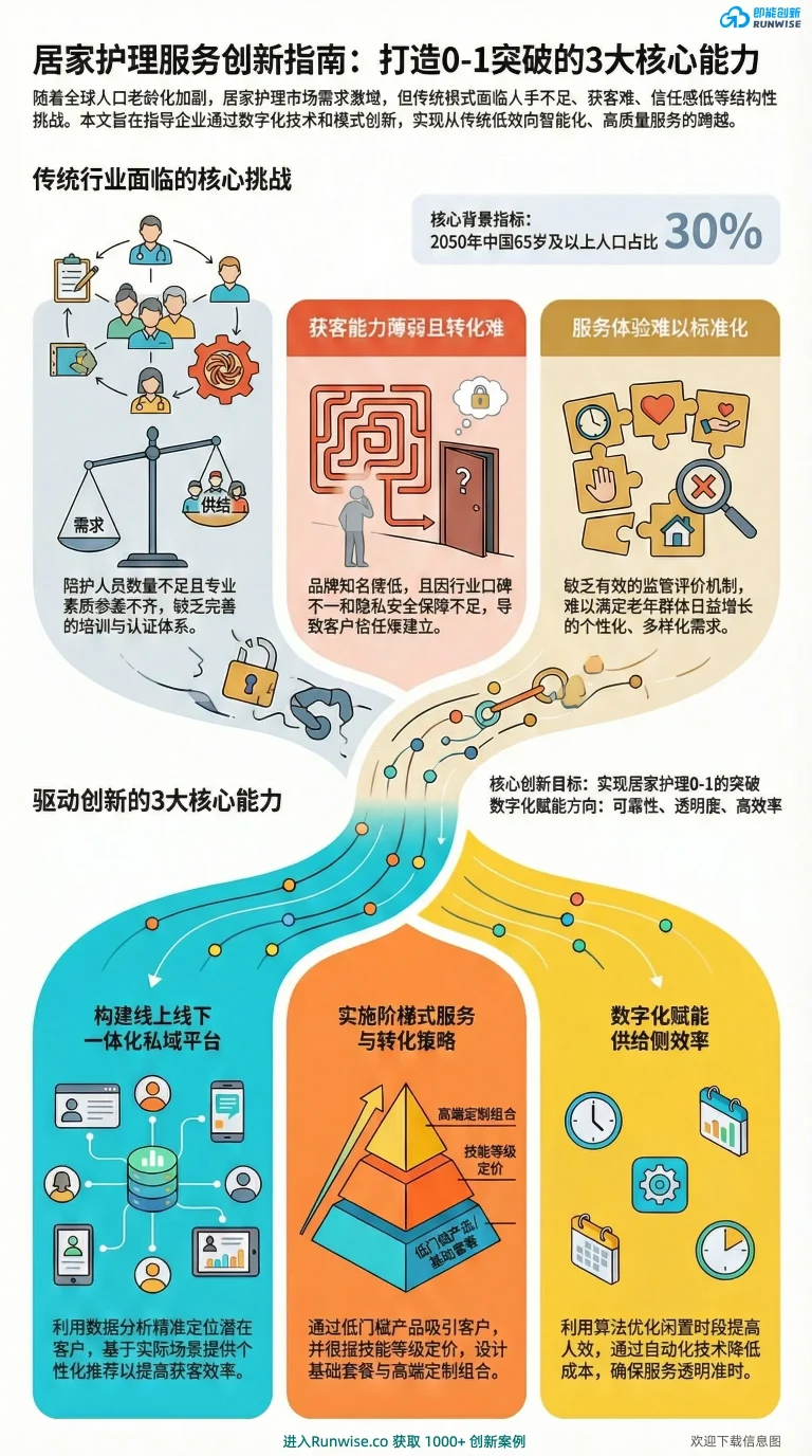 随着2050年中国65岁及以上人口占比将攀升至30%,居家护理市场正迎来前所未有的爆发期,但获客难、信任感低等结构性挑战仍让许多初创品牌折戟沉沙。这张图深度解构了从私域运营到供给侧增效的底层逻辑。答案就在下方的实战指南中。