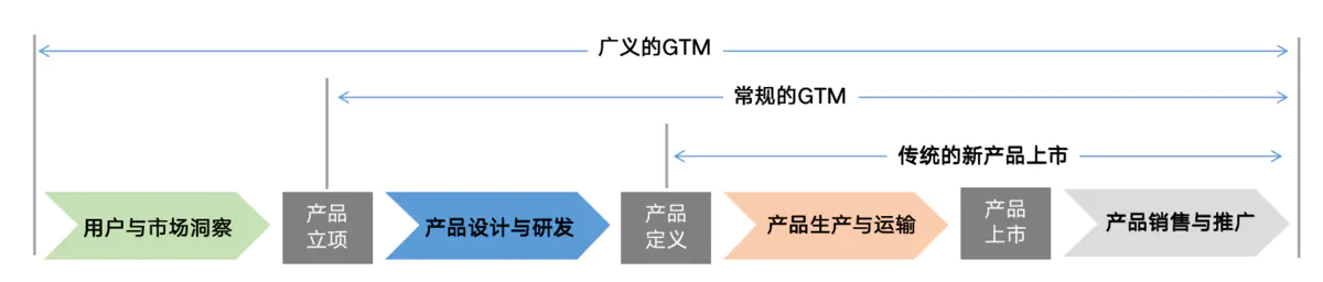 GTM=Go to market,字面意思是”市场通路“。简而言之, GTM旨在产品经理/项目经理在将新产品或新创意推向市场时应该采取的策略以及所需开展的一系列工作。这里面的“一系列”,既包括产品上市前、中、后纵向的时间周期范围,也包括研发、产品、销售、营销等横向的业务部门范围。有别于品牌活动、促销活动等涉及到多个产品的项目,GTM一般只作用于一款产品或一个产品系列。